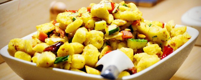 3、依次加入胡蘿卜丁、洋蔥丁、辣椒丁、黃瓜丁、饅頭塊翻炒。加入食鹽1茶匙、生抽2毫升,饅頭塊炒至表面金黃即可。